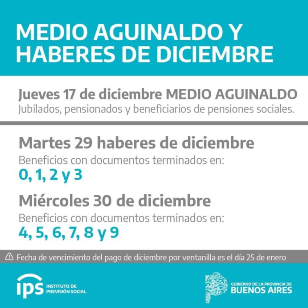 Los jubilados y pensionados de la provincia de Buenos Aires percibirán desde el martes próximo los haberes del mes de diciembre, informó el Instituto de Previsión Social Bonaerense (IPS).