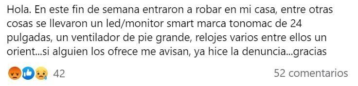 "Entre otras cosas, se llevaron un Smart TV LED Tonomac de 24 pulgadas, un ventilador de pie grande y relojes varios, entre ellos, un Orient", relató la víctima en su posteo. Luego del episodio, y con los implicados ya lejos de su vista, explicó que llamó a la Policía. No obstante, fuentes policiales aseguraron a 0221.com.ar que la comisaría Décima -con jurisdicción en la zona- no tomó ninguna denuncia al respecto.