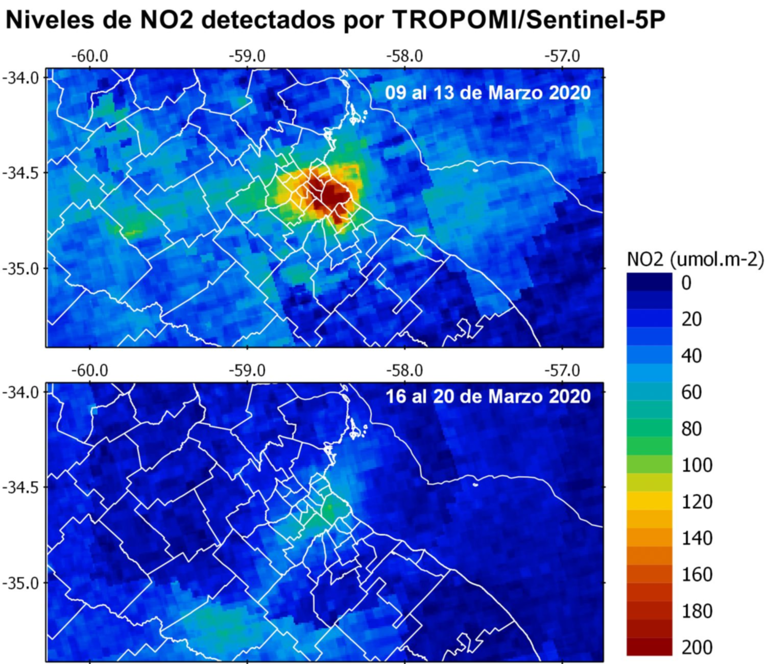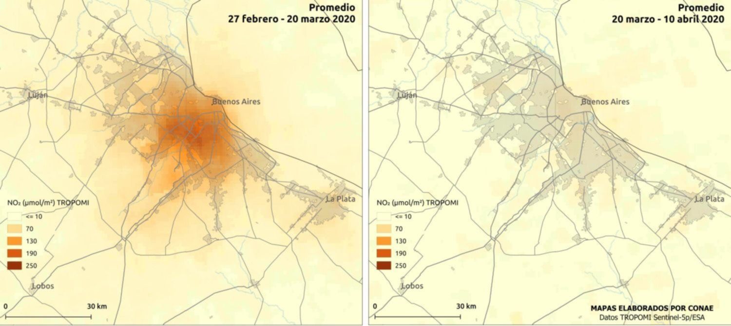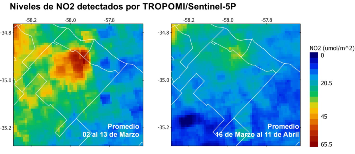 Según un informe preliminar, elaborado por un grupo de investigadores del Centro de Investigaciones del Medio Ambiente (CIM) en abril de este año, en la ciudad hubo una disminución de los niveles de dióxido de nitrógeno (NO₂). El trabajo se realizó en base a imágenes satelitales de la parte baja de la atmósfera –la troposfera–, que fueron sacadas por TROPOspheric Monitoring Instrument (Tropomi) de la misión Sentinel-5P.