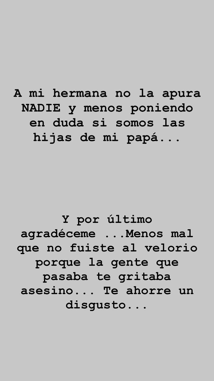 "A mi hermana no la apura nadie y menos poniendo en duda si somos hijas de mi papá. Y por último, agradeceme. Menos mal que no fuiste al velorio porque la gente que pasaba te gritaba asesino. Te ahorré un disguto", cerró en tanto para defender a Gianinna.