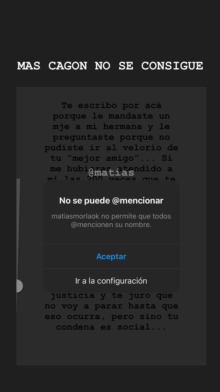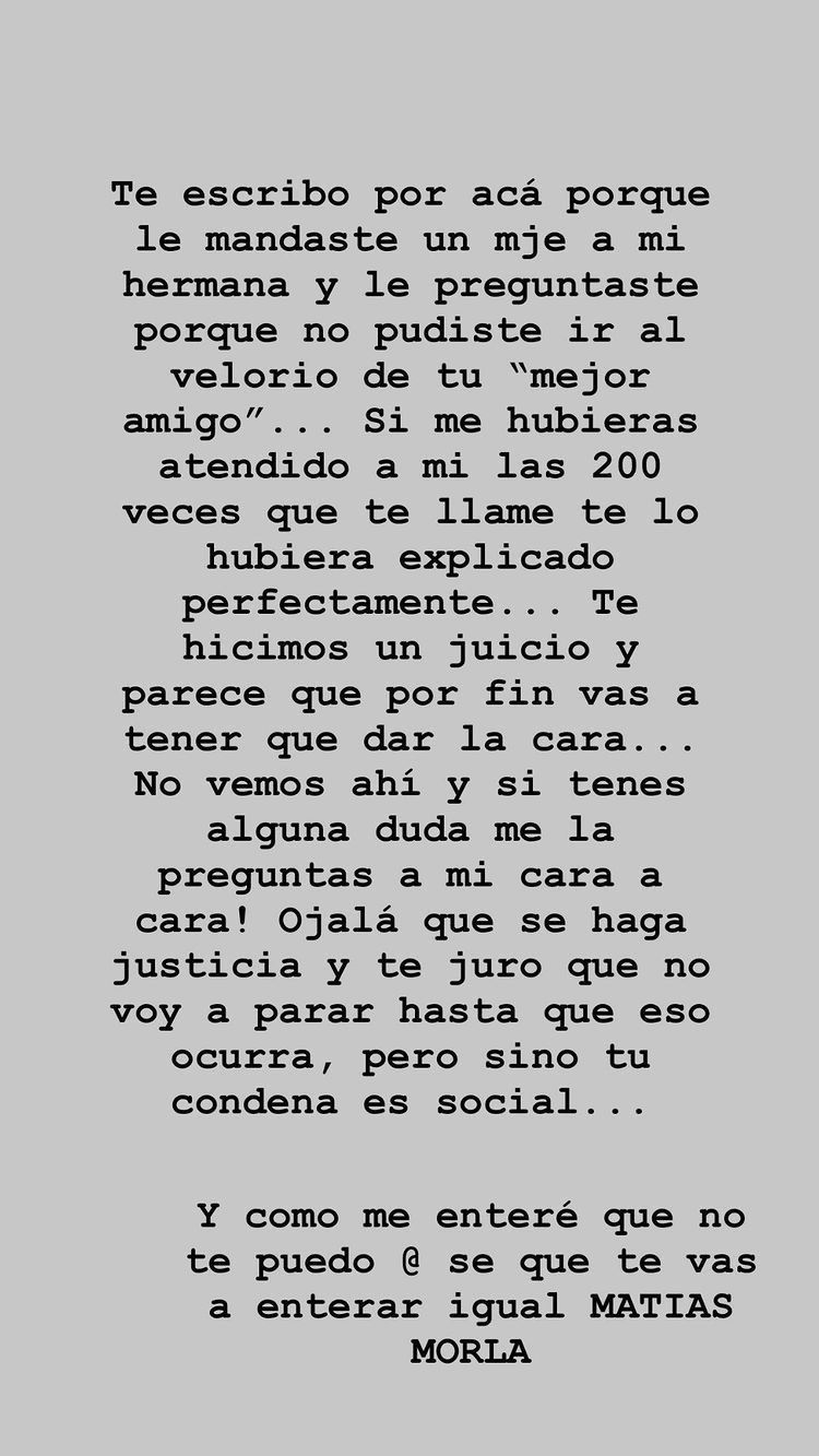 La joven se volcó a Instagram para responderle y allí le dejó fuertes mensajes advirtiéndole que se verán las caras en el juicio que ya le inició. "Le mandaste un mensaje a mi hermana y le preguntaste por qué no pudiste ir al velorio de tu mejor amigo. Si me hubieras atendido a mí las 200 veces que te llamé te lo hubiera explicado perfectamente. Te hicimos un juicio y parece que por fin vas a tener que dar la cara", escribió la joven y como no pudo arrobarlo, agregó: "Más cagón no se consigue".