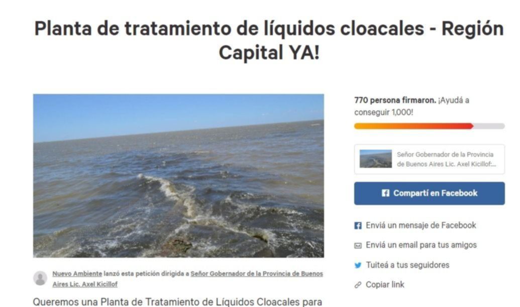 La ONG Nuevo Ambiente junto a vecinos de La Plata, Berisso y Ensenada pide a través de la plataforma Change.org que lleve adelante una nueva planta de tratamientos cloacales o bien se modernice la actual que funciona en Berisso, en 40 y 165, y se repare el caño que corre paralelo a la avenida 66 y desemboca en el Río de la Plata.