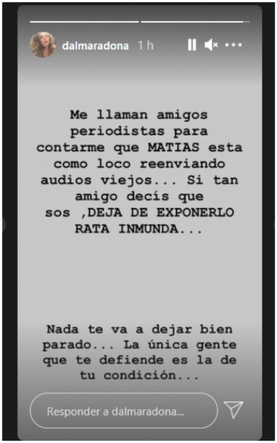 “Me llaman amigos periodistas para contarme que Matías está como loco reenviando audios viejos”, publicó en un segundo posteo de Dalma, acusando a Morla de filtrar material relacionado con Maradona. Frente a esto le reclamó que, si tan amigo dice haber sido del ídolo, no lo exponga más. “Rata inmunda. Nada te va a dejar bien parado, la única gente que te defiende es la de tu condición”, le expresó molesta.