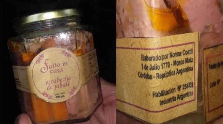 Se trata todos los artículos de la firma “Fatto in casa”, incluido el “Escabeche de Pollo”, “Escabeche deshuesado de pavita”, “Escabeche deshuesado de vizcacha” y el “Escabeche de jabalí”, elaborados de forma artesanal por Norma Coatti en San Marcos Sierra (provincia de Córdoba).