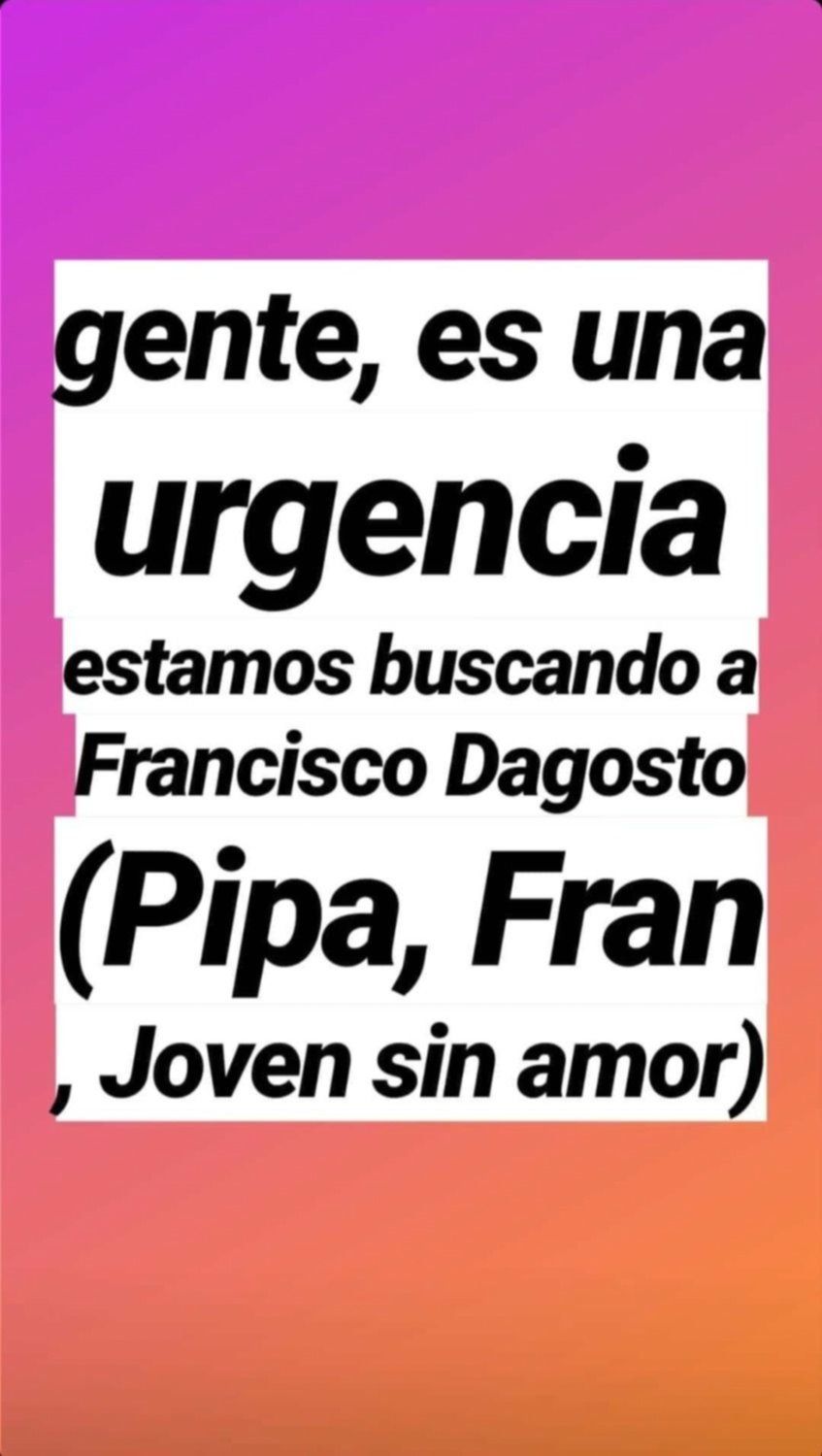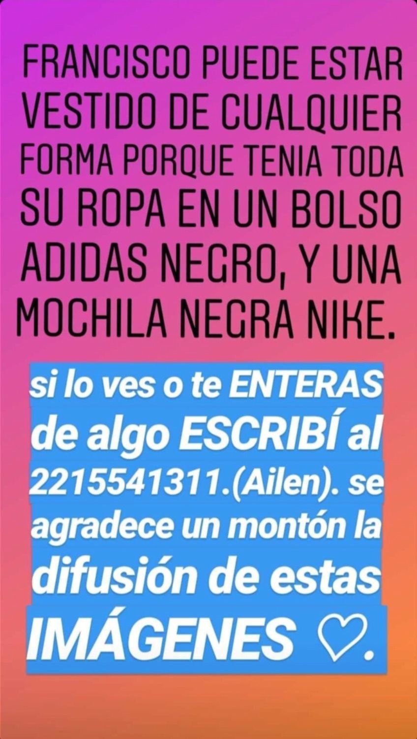 "Fran se fue con un bolso lleno de ropa y no volvió a dar señales", contó Ailén, una de las chicas que vivía con él, a 0221.com.ar. En esa línea, contó que los papás del joven se presentaron con la policía en la casa de Barrio Hipódromo donde vivían y constataron que se había ido del lugar.