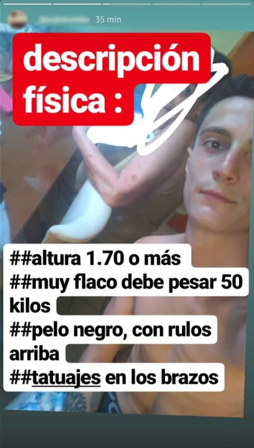 Asimismo, los padres detallaron que el joven mide 1.70 metros, tiene pelo negro con rulos, tatuajes en los brazos y es muy flaco, pesaría unos 50 kilos; y agregaron que "puede estar vestido de cualquier manera porque se llevó un bolso Adidas negro lleno de ropa y una mochila negra Nike". "Si lo ves avisá al (0221) 15 554-1311", concluyeron.