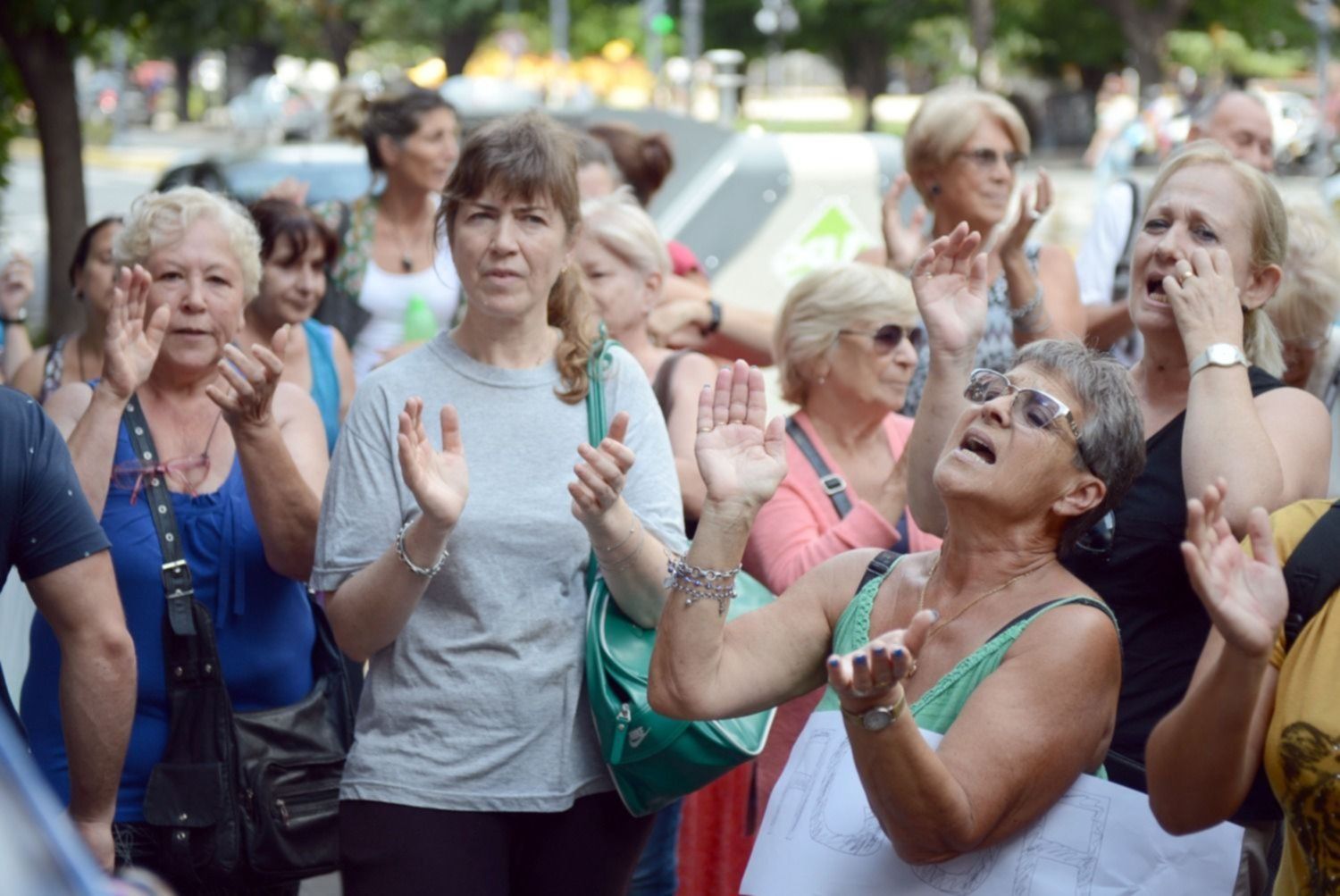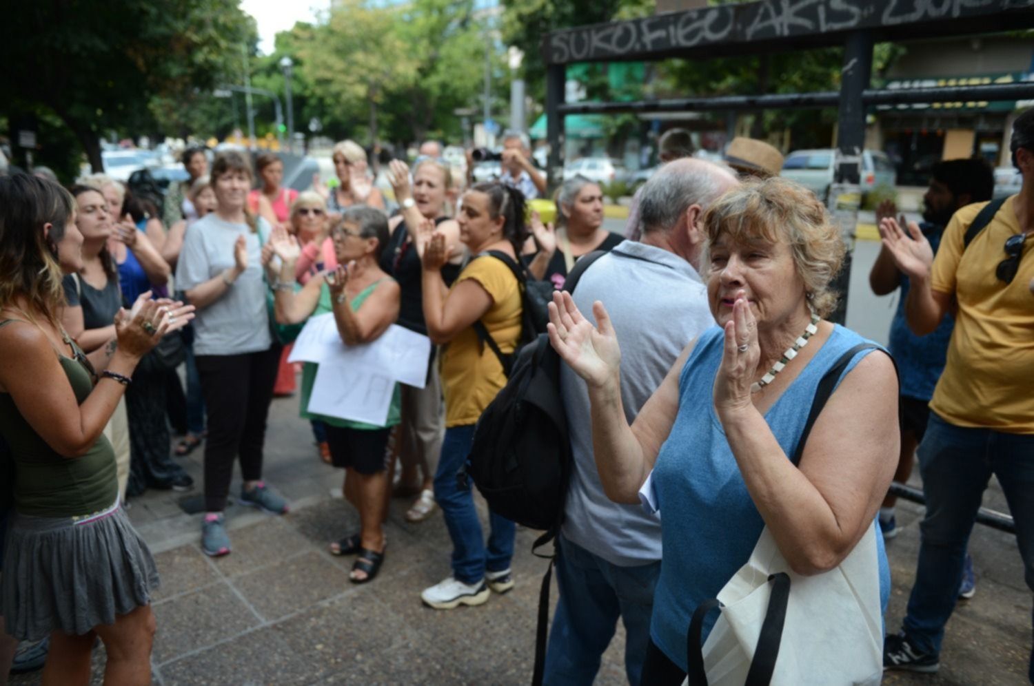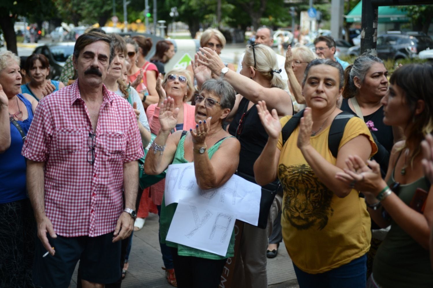 Llegaron pasado el mediodía y se encontraron con una fuerte custodia policial cubriendo el frente. El grupo se paró sobre la vereda sin cortar el tránsito de la avenida 7 y la el reclamo se limitó a algunos cánticos y un aplauso. Muchos de ellos portaron carteles indicando el barrios al cual pertenecen.