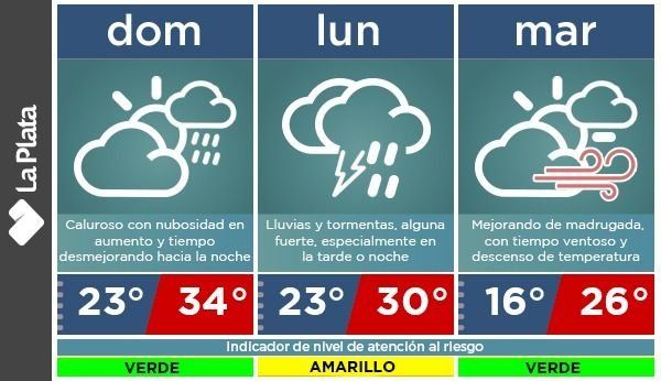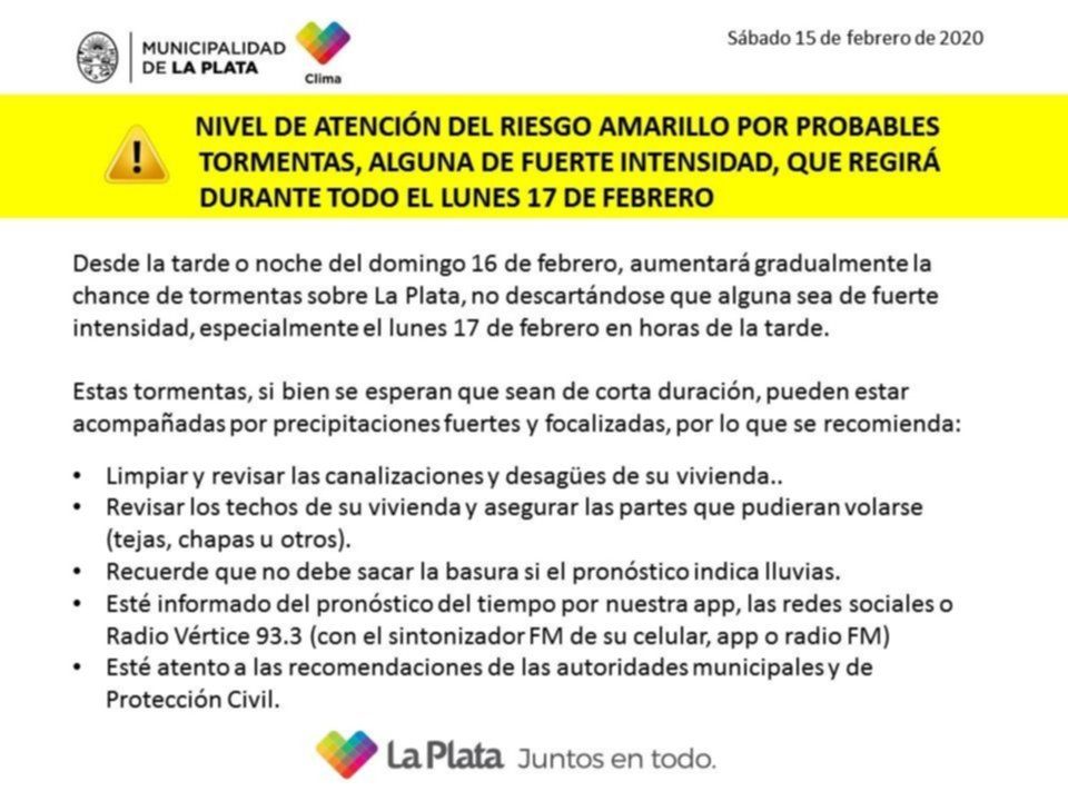 Al respecto, los meteorólogos municipales adelantaron que "desde la tarde o noche del domingo aumentará gradualmente la chance de tormentas sobre La Plata, no descartándose que alguna sea de fuerte intensidad, especialmente el lunes en horas de la tarde" y agregaron una serie de recomendaciones a tener en cuenta para evitar inconvenientes ante las intensas precipitaciones.