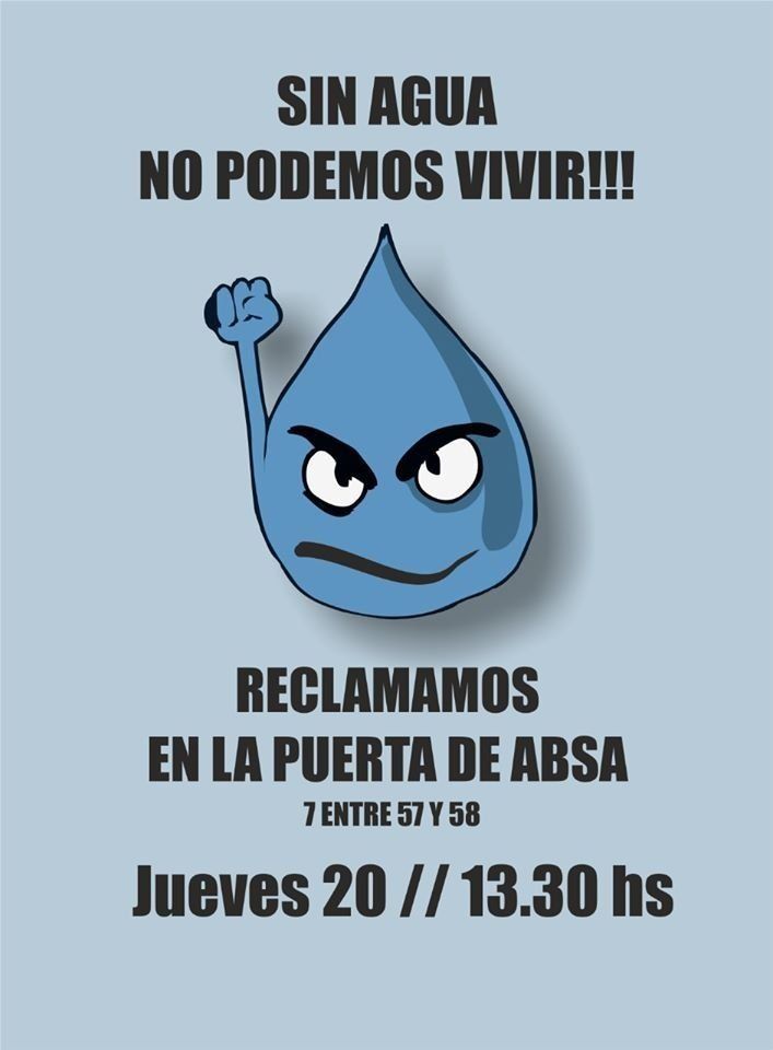 La protesta está convocada para este jueves a las 13.30 frente a la oficina de 7 entre 57 y 58. Según denunciaron, no tuvieron respuesta al pedido que hicieron el viernes pasado en cuanto a un “informe público de las causas que generan los problemas en el suministro de agua para cada barrio y plazos estimados de resolución” y el pedido de reunión con el nuevo presidente de la empresa, Germán Ciucci.