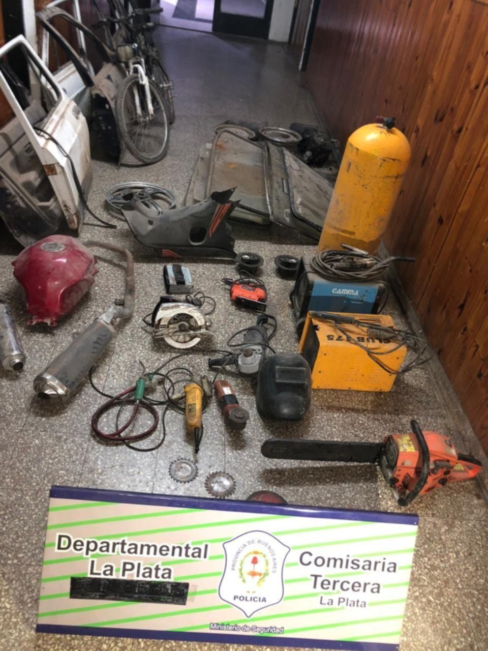 Entre los elementos que se incautaron había puertas, parabrisas, tubos de GNC, llantas, estéreos, parlantes, tanques de nafta, tableros, caños de escape, amoladoras, discos de corte, soldadoras eléctricas, sierras, una bicicleta de alta gama y hasta prendas de vestir.