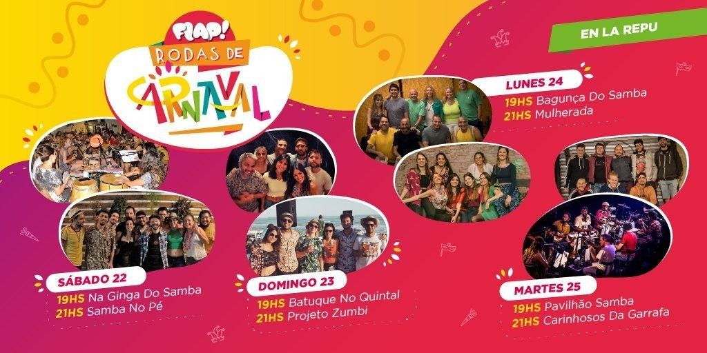 El espíritu del carnaval llega a la República con esta interesante propuesta que invita al público a disfrutar de la samba. Estarán “Na Ginga Da Samba”, “Samba No Pé”; “Batuque No Quintal”, y “Pojeto Zumbi”. También tendrá lugar el espectáculo de “Bagunça Da Samba”, “La Mulherada”, “Pavilhão Samba”, y el cierre a cargo de los “Carinhosos Da Garrafa”.