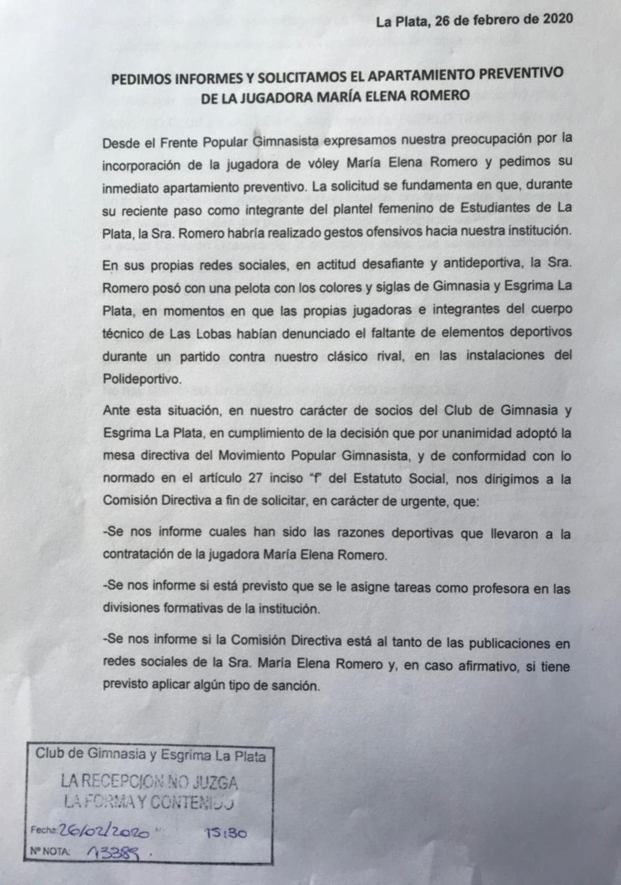 Desde el Frente Popular Gimnasista lanzaron esta petición basándose en el “artículo 27 inciso “f” del Estatuto Social”. Por lo tanto solicitan a los actuales dirigentes que informen “las razones deportivas que llevaron a la contratación de la jugadora” y “si está previsto que se le asigne tareas como profesora en las divisiones formativas de la institución”, entre otras cosas.
