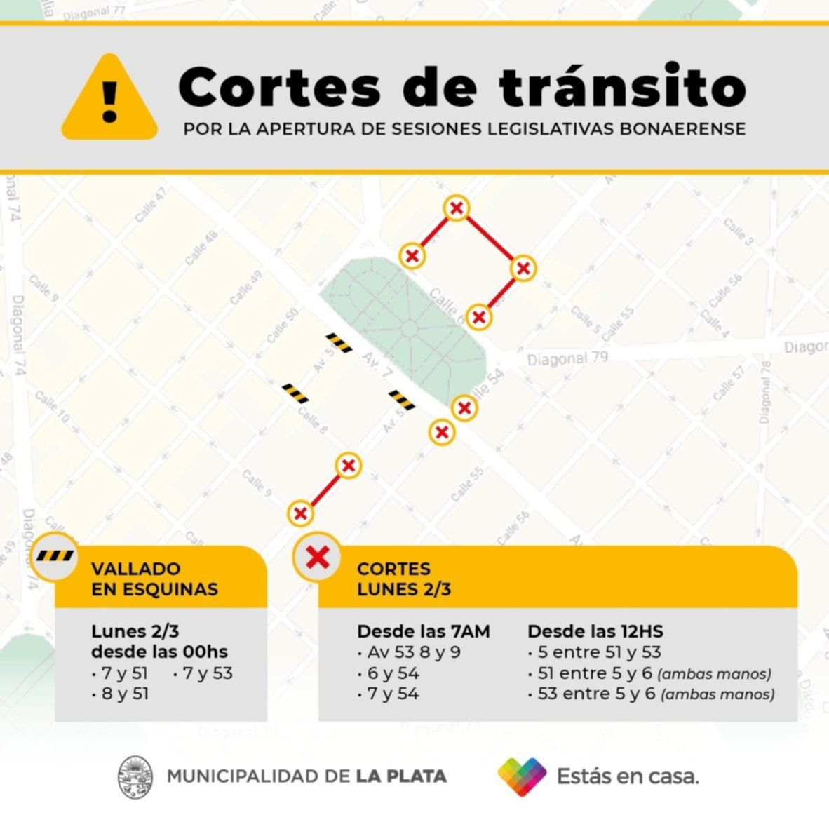 A raíz de la apertura del 148 período de sesiones ordinarias de la Legislatura de la provincia de Buenos Aires, el Municipio informó sobre los cortes y desvíos de tránsito que se realizarán en el centro de la ciudad, durante la cita que se llevará adelante el próximo lunes.