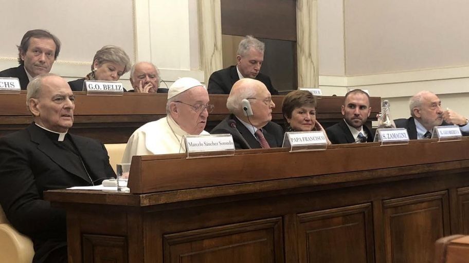 La entrevista se dio en el marco de un encuentro organizado en Roma por la Pontificia Academia de Ciencias Sociales del Vaticano, denominado "Nuevas formas de fraternidad solidaria de inclusión, integración e innovación (I+I+I)", en el que participaron Guzmán y Georgieva, en el que el pontífice llamó "a la acción" de los pueblos para aliviar la carga de la deuda de las naciones más endeudadas.