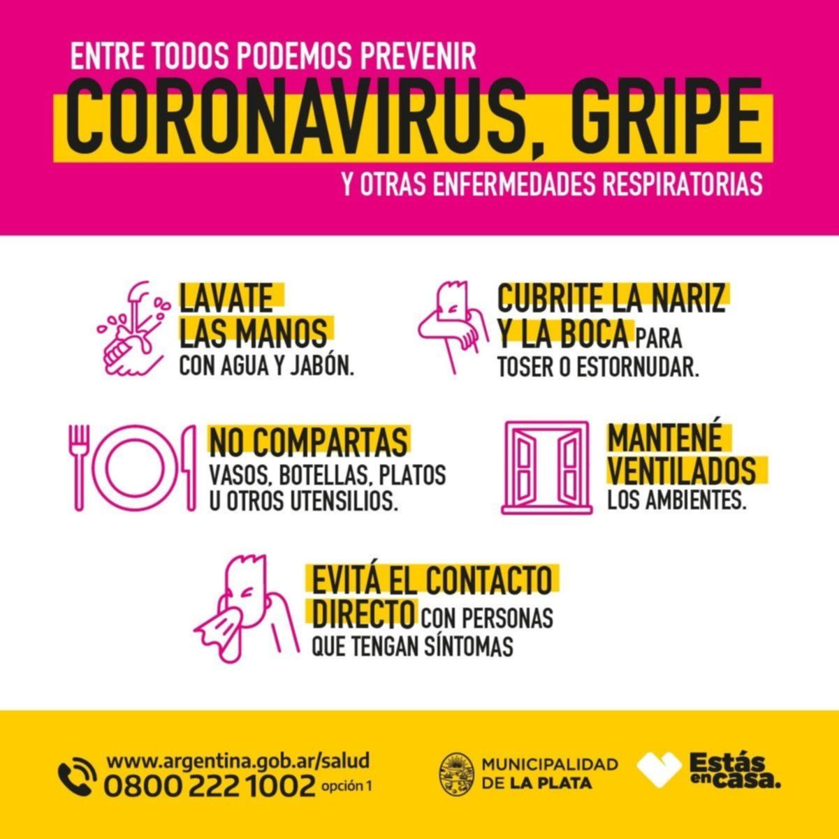 En ese sentido, aconsejaron a los vecinos mantener ventilados los ambientes, lavarse las manos con agua y jabón y utilizar alcohol en gel de manera frecuente. Asimismo, se recomendó cubrirse la nariz y la boca para toser o estornudar, evitar el contacto directo con personas que tengan síntomas, como fiebre junto con tos, dolor de garganta o dificultad respiratoria; y no compartir platos, cubiertos, vasos, tazas, botellas ni otros utensilios.