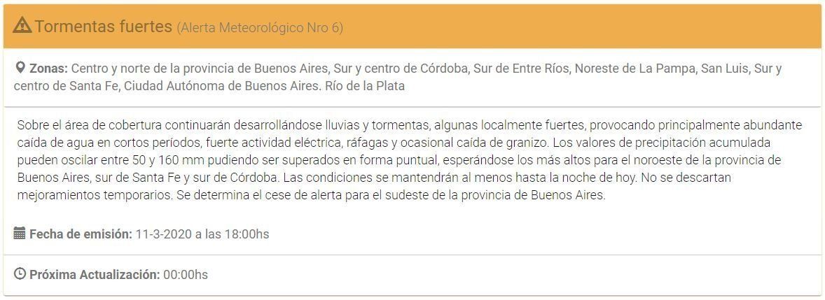 El Servicio Meteorológico Nacional (SMN) emitió una nueva alerta para la ciudad y la región e informó que "continuarán desarrollándose lluvias y tormentas, algunas localmente fuertes, provocando principalmente abundante caída de agua en cortos períodos". Aunque el tiempo mejoró en las últimas horas, los expertos no descartan que las condiciones del tiempo vuelva a empeorar hacia la madrugada del próximo jueves.