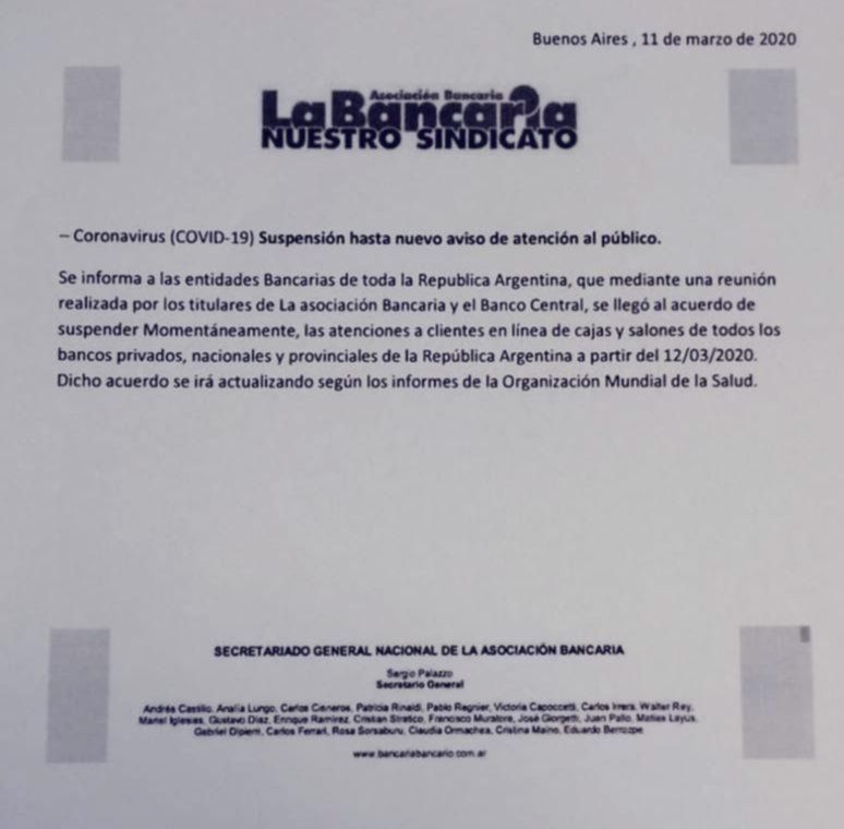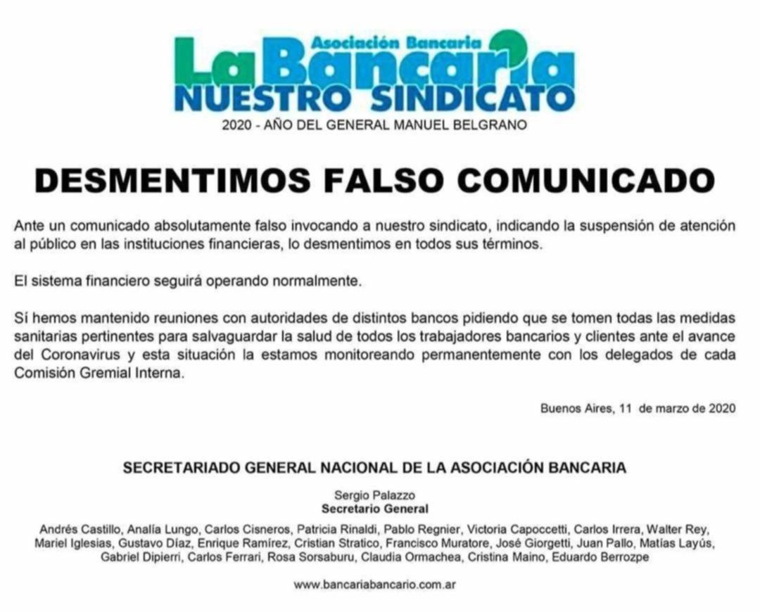 El falso comunicado disponía, incluso, del logo y las firmas del Secretariado General Nacional del sindicato de trabajadores bancarios y por ello corrió como reguero de pólvora en las redes. En ese marco, se informaba sobre un supuesto "acuerdo" entre los representantes del gremio y las autoridades del Banco Central para suspender la atención "en las líneas de cajas y salones de todos los bancos privados, nacionales y provinciales" desde el próximo jueves.