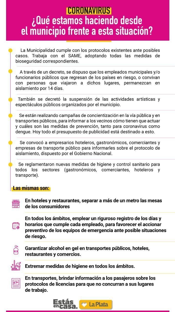 Es importante destacar que la Comuna viene desarrollando encuentros con los responsables del servicio de transporte público de pasajeros y empresarios hoteleros de la ciudad, al tiempo que el próximo jueves hará lo propio con taxistas, remiseros y transportistas escolares de la ciudad. "La prevención es más efectiva si la trabajamos en conjunto con todos los integrantes de la sociedad platense", afirmó el secretario de Salud Rifourcat.