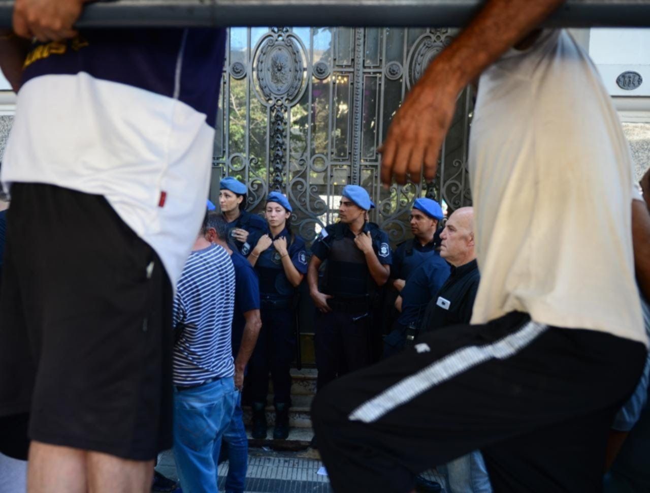 El edificio se encontraba custodiado por policías que impidieron el ingreso por lo que se produjeron forcejeos y se registraron algunos golpes e insultos.