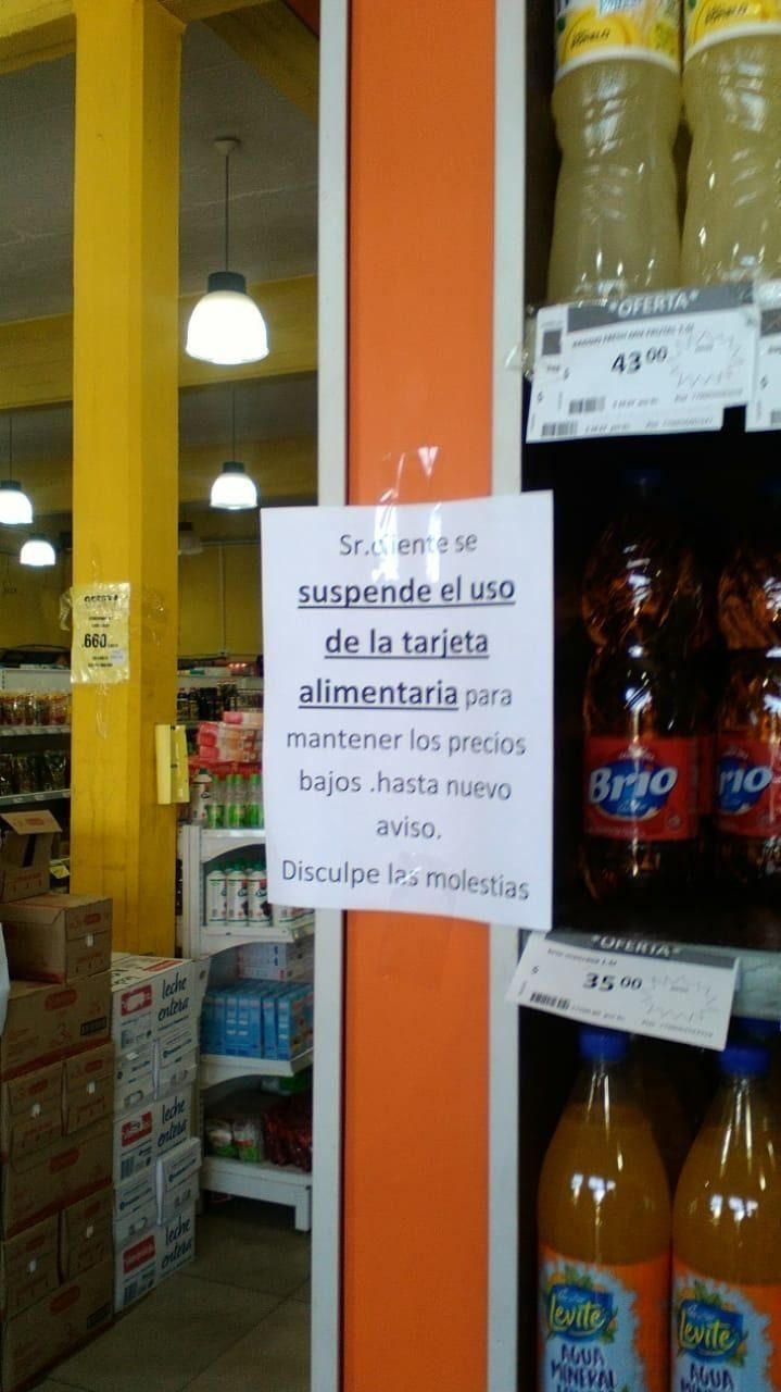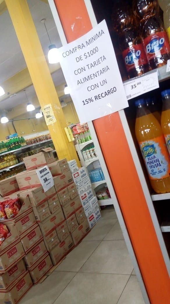 Durante la intervención, los inspectores visualizaron dos carteles. Uno pegado en la puerta de ingreso del comercio que decía "Sr. Cliente: se suspende el uso de la tarjeta alimentaria para mantener los precios bajos hasta nuevo aviso. Disculpe las molestias", mientras que en el segundo podía leerse "Compra mínima de $1.000 con tarjeta alimentaria con un 15% de recargo".