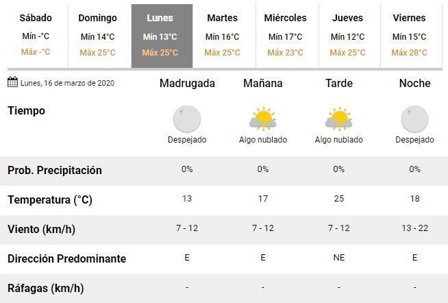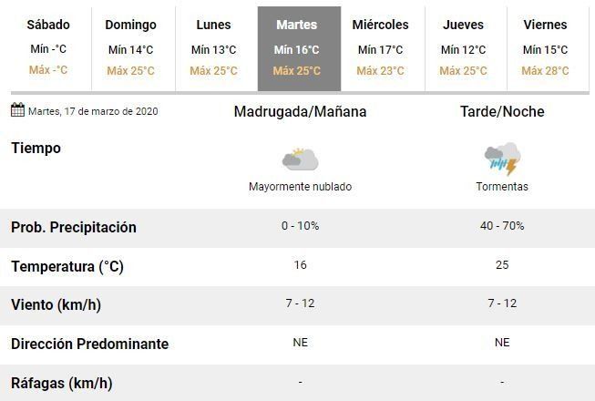 Finalmente, entrada la tarde y noche del martes, se espera que las condiciones climáticas empeoren rápidamente, pudiendo registrarse algunas tormentas de variada intensidad sobre la ciudad. La temperatura, en tanto, irá de 16 a 25°C a lo largo del día.