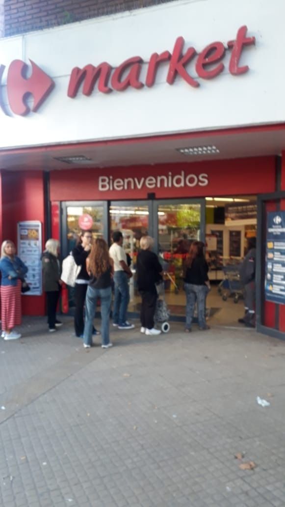 En el Carrefour de calle 12 y 57, este lunes desde muy temprano se pudieron percibir largas colas. Las personas forman fila sobre la vereda, ya que desde el supermercado se encuentran restringiendo el ingreso.
