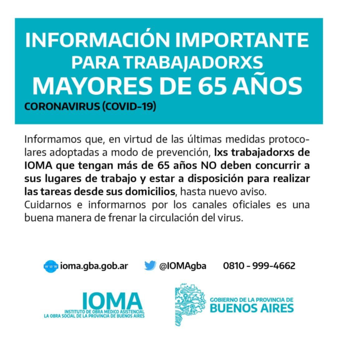 La sede central de IOMA no atenderá público. “En virtud de las últimas medidas protocolares adoptadas a modo de prevención, informamos que, desde el lunes 16 de marzo, y hasta nuevo aviso, IOMA cierra sus puertas de atención al público, proveedores y prestadores en su sede central de 46 entre 12 y 13”.