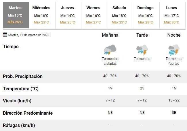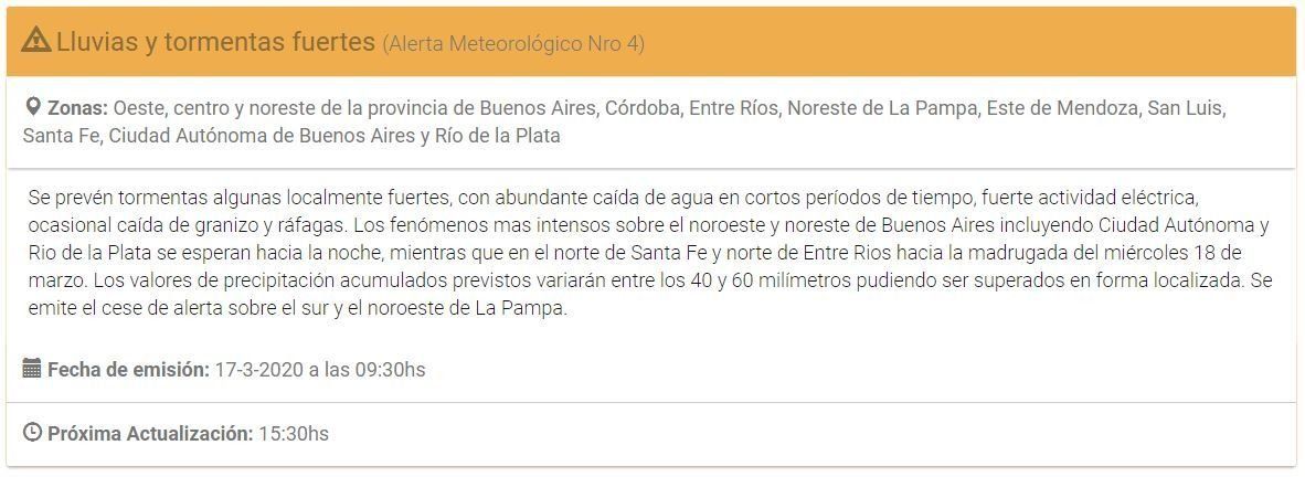 En concreto, el SMN indicó que se prevén tormentas, algunas "localmente fuertes" y con "abundante caída de agua en cortos períodos de tiempo fuerte actividad eléctrica, ocasional caída de granizo y ráfagas".