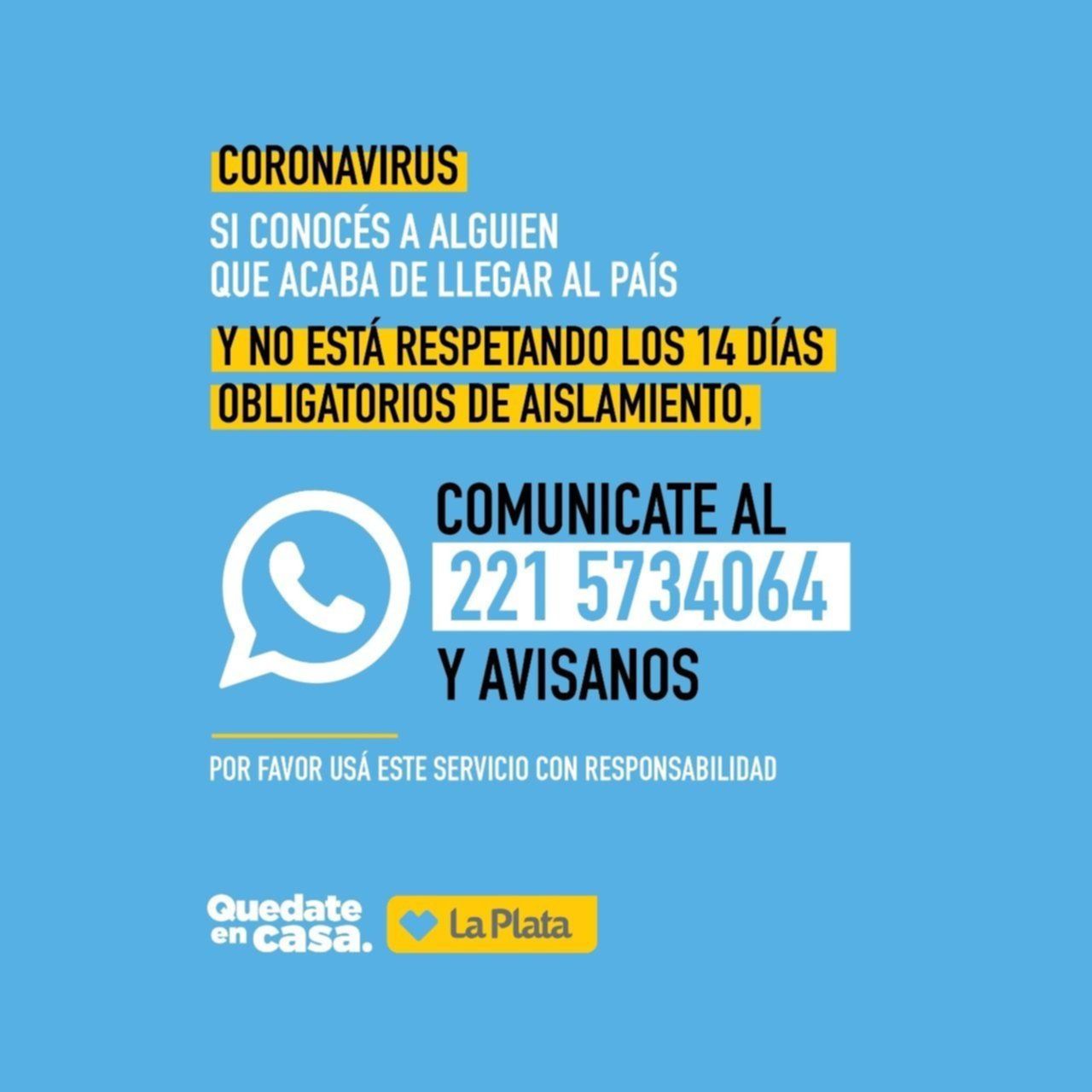 Una de las líneas es el 147 de atención al vecino y la otra es el 221-5734064, una línea de WhatsApp que habilitó la Comuna para denunciar aquellas personas que regresaron al país en los últimos días y no estén cumpliendo con la cuarentena que impuso el Gobierno Nacional.