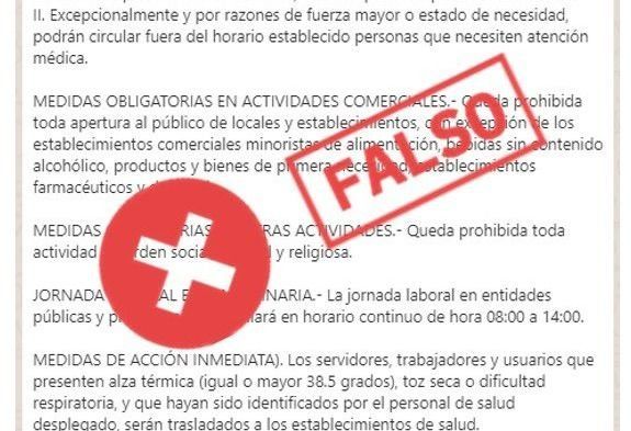 El falso decreto circuló por WhatsApp pero fue desmentido rápidamente. Se plantean allí duras medidas que restringe en extremo la circulación en el país para todos "los estantes y habitantes" que "deberán permanecer en sus domicilios a partir de las 15:00 horas, con excepción de personal autorizado".