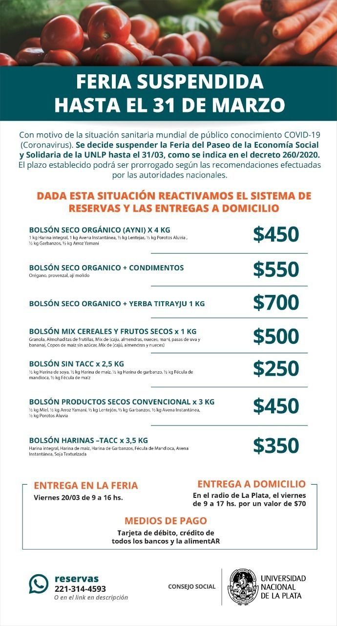 El Paseo de la Economía Social de la UNLP suspendió las tradicionales ferias que se realizan todos los viernes en el ingreso al edificio del Rectorado, en 7 entre 47 y 48; con el fin de acatar las recomendaciones sanitarias que impulsa el Gobierno nacional y la propia casa de altos estudios para evitar la concurrencia y aglomeración de personas. Sin embargo, los más de 60 productores que impulsan la iniciativa decidieron reactivar el sistema de reservas y entregas a domicilio de bolsones de frutas, verduras y cereales y ofrecer combos a precios imperdibles.