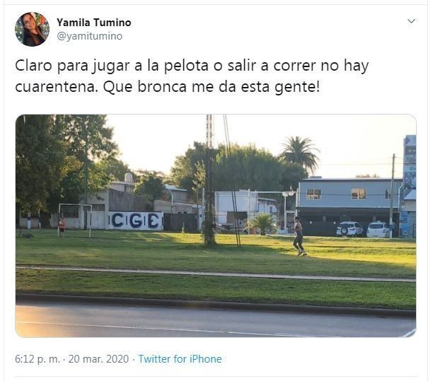 La imagen fue compartida por en Twitter, donde despertó críticas de otras personas que se encuentran en sus hogares, respetando la cuarentena que se extenderá hasta el próximo 31 de marzo. "Claro para jugar a la pelota o salir a correr no hay cuarentena", escribió Yamila Tumino en Twitter y agregó: "¡Que bronca me da esta gente!".
