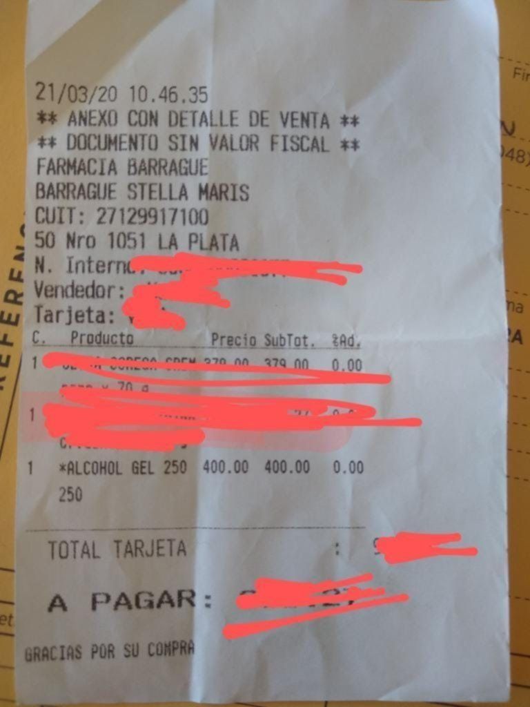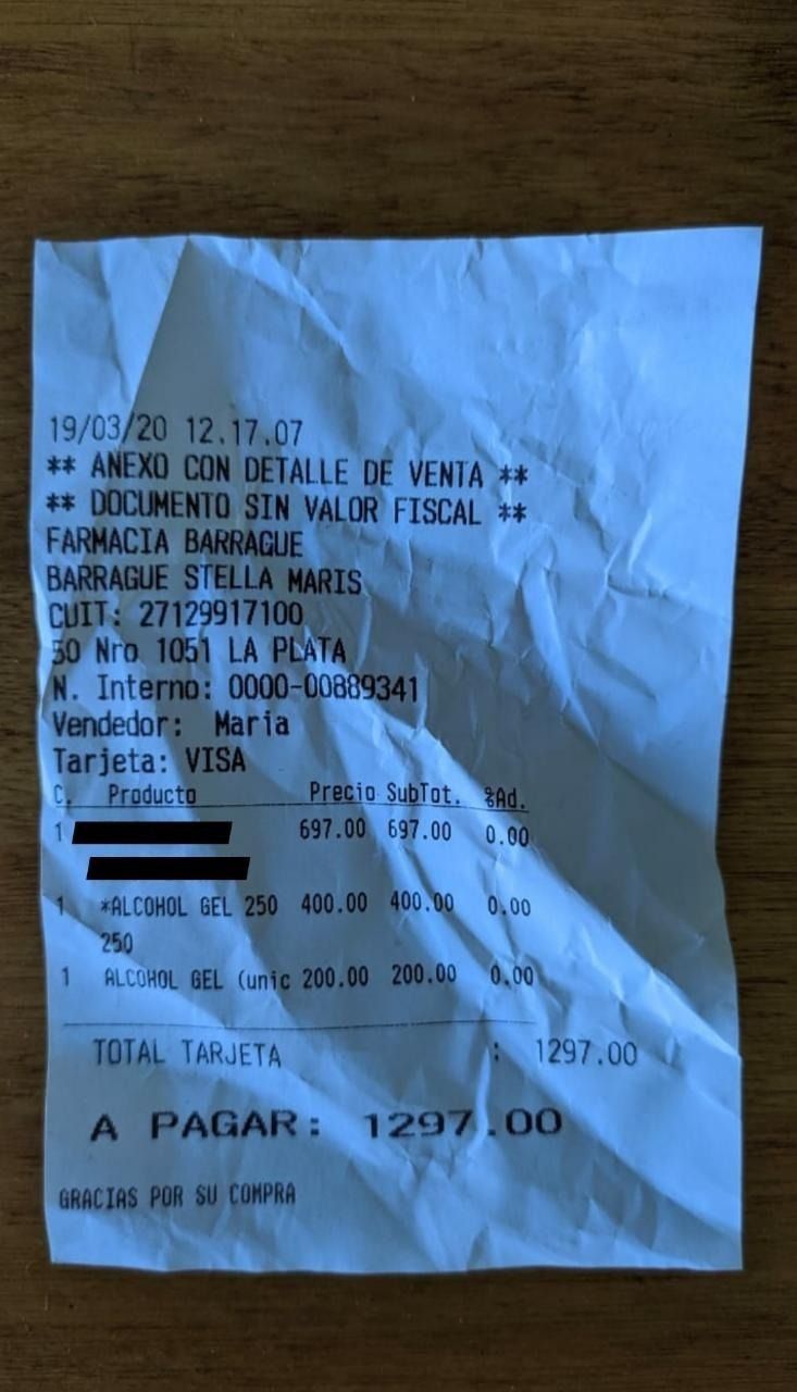 Uno de estos casos sucede en la Farmacia Barrague, ubicada en la esquina de calle 50 y 16, la cual comercializa el alcohol en gel de 250ml a 400 pesos. Varios platenses fueron a comprar el producto a ese local, mostraron una gran indignación al ver el precio y sacaron la foto del ticket, enviando así su queja al WhatsApp de 0221.