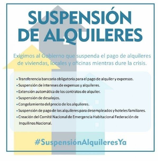 Por dicho motivo, es que desde la Federación sostienen: “En el transcurso de estos días se han anunciado diferentes medidas urgentes y extraordinarias para paliar el impacto económico y social del COVID-19 y creemos fundamental y urgente llevar adelante medidas para los inquilinos y las inquilinas por el plazo de 60 días”.