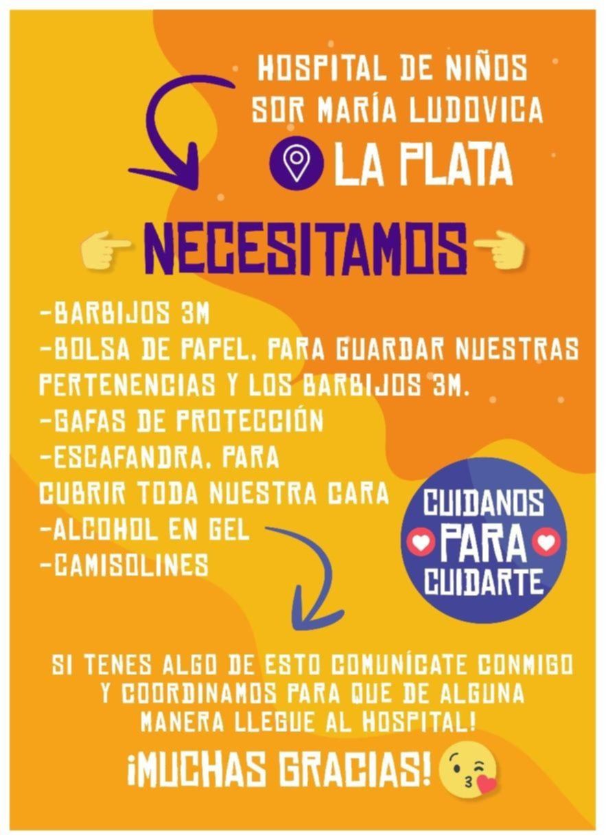 De esta manera, la iniciativa pretende fortalecer las condiciones en el Sor María Ludovica para enfrentar la propagación del coronavirus, y para lograrlo intentarán juntar barbijos 3M, bolsas de papel, gafas de protección, escafandras, alcohol en gel y camisolines.