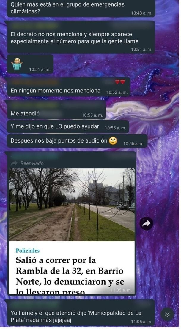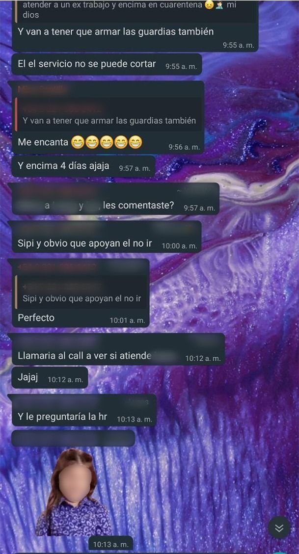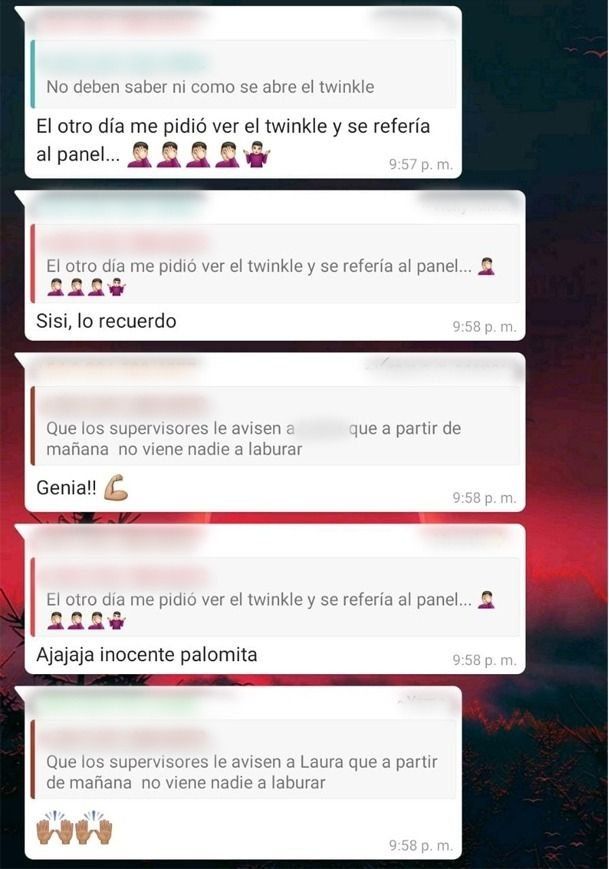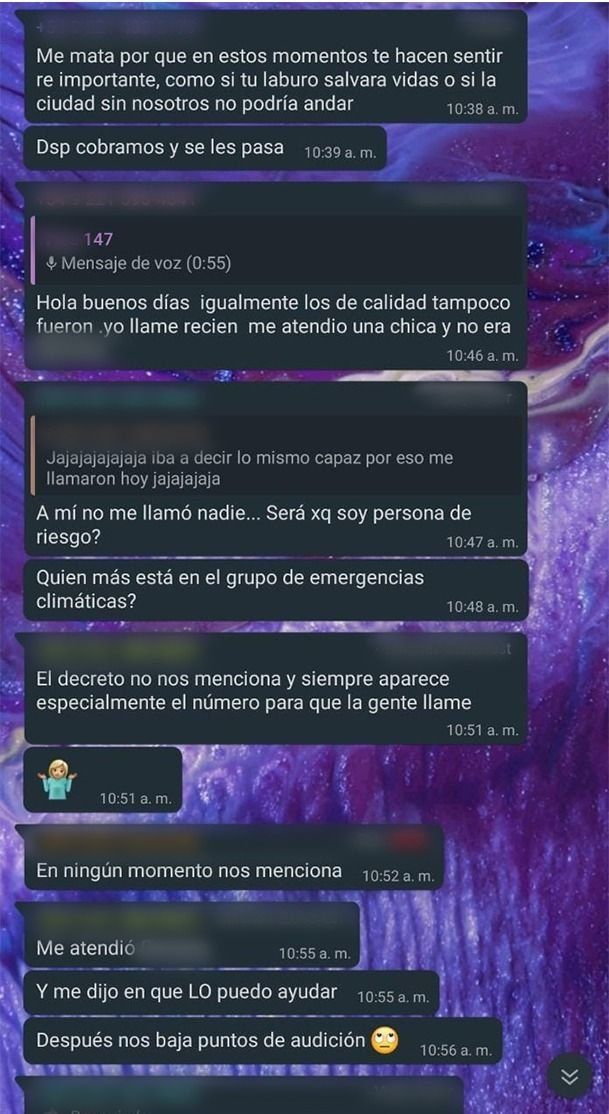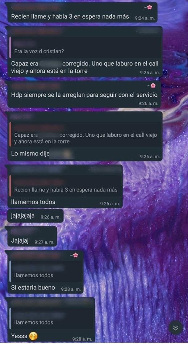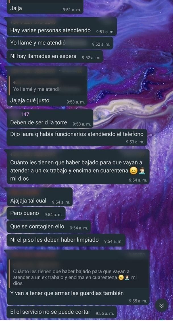 En esos mensajes, que serían de los trabajadores, probarían la coordinación de la decisión conjunta de no concurrir a trabajar en el inicio del aislamiento, pero también la articulación para realizar llamados a la Línea 147 y saturar la demanda, comprobar si el servicio funciona y quiénes son los operadores o determinar el impacto de la medida de fuerza. También podrían detectarse bromas y burlas respecto de otros trabajadores y funcionarios y finalmente algunas reacciones ante las inminentes sanciones de las cuales serían objeto.