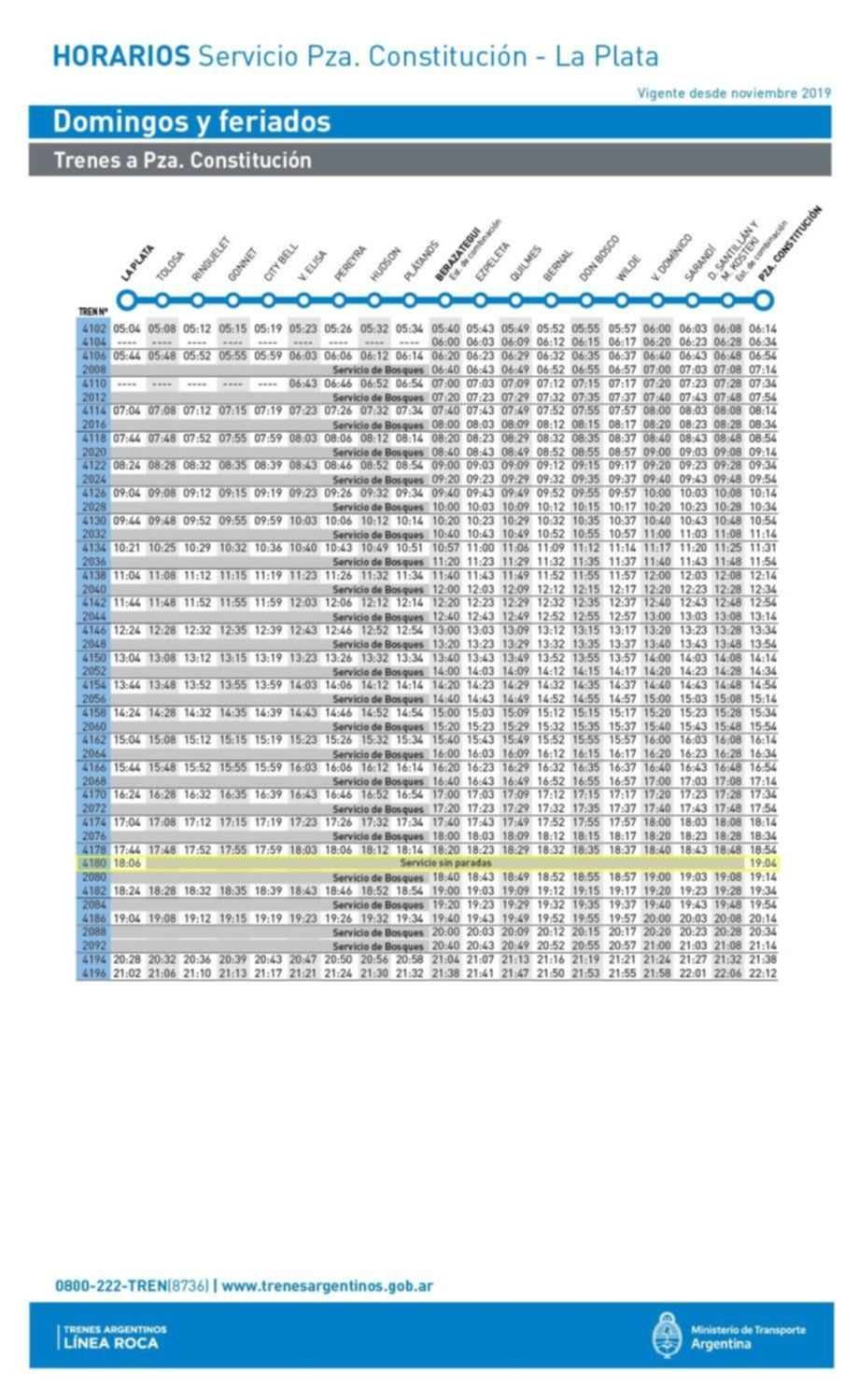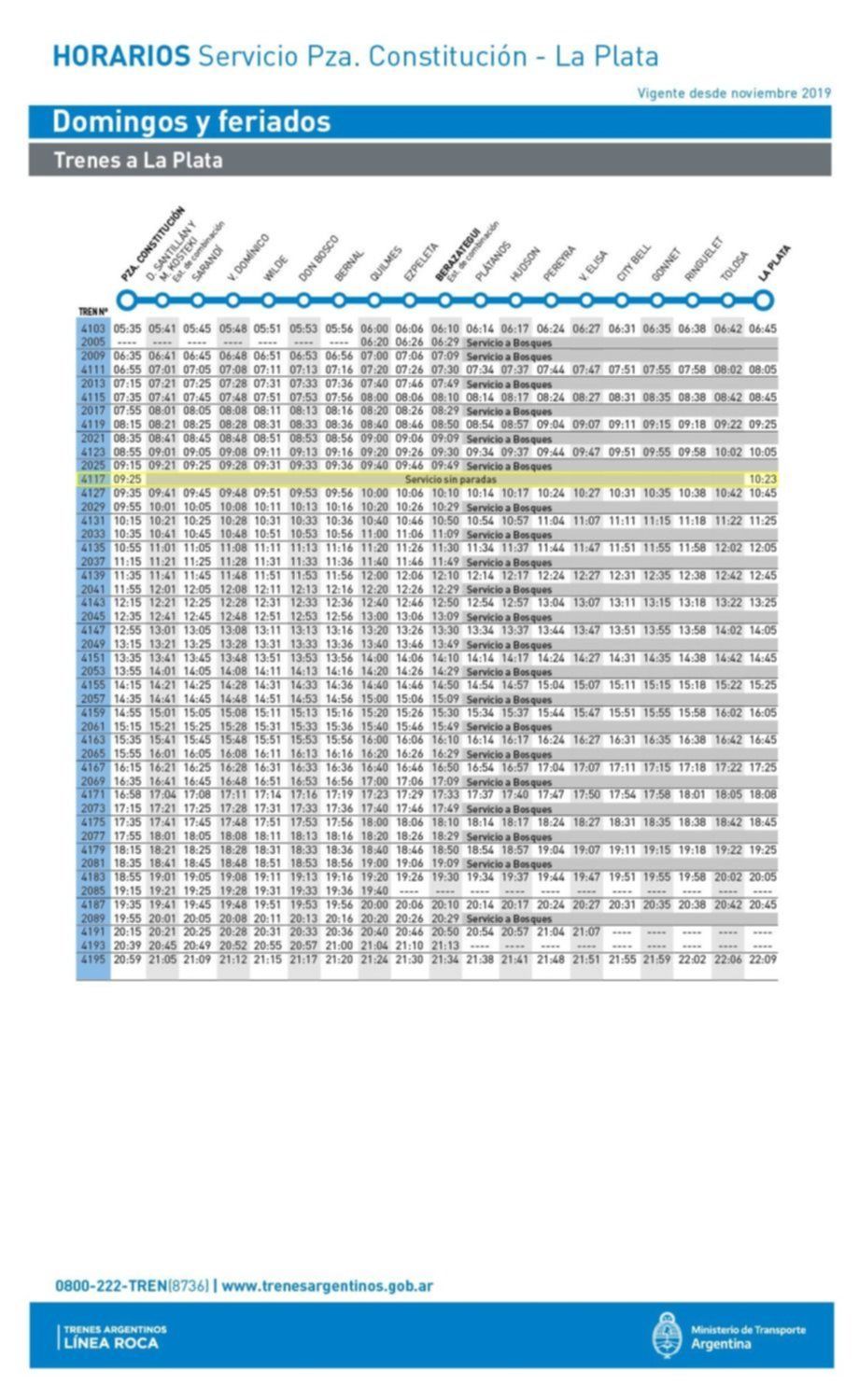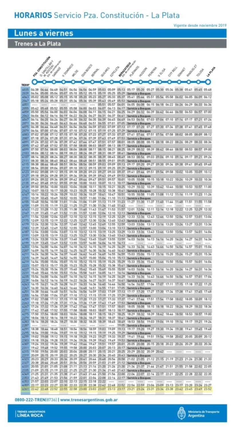 Los domingos y feriados, en tanto, el recorrido desde Constitución hasta La Plata comenzará a las 9.25 y terminará 10.23, mientras en sentido a la Capital Federal irá de 18.06 a 19.04.