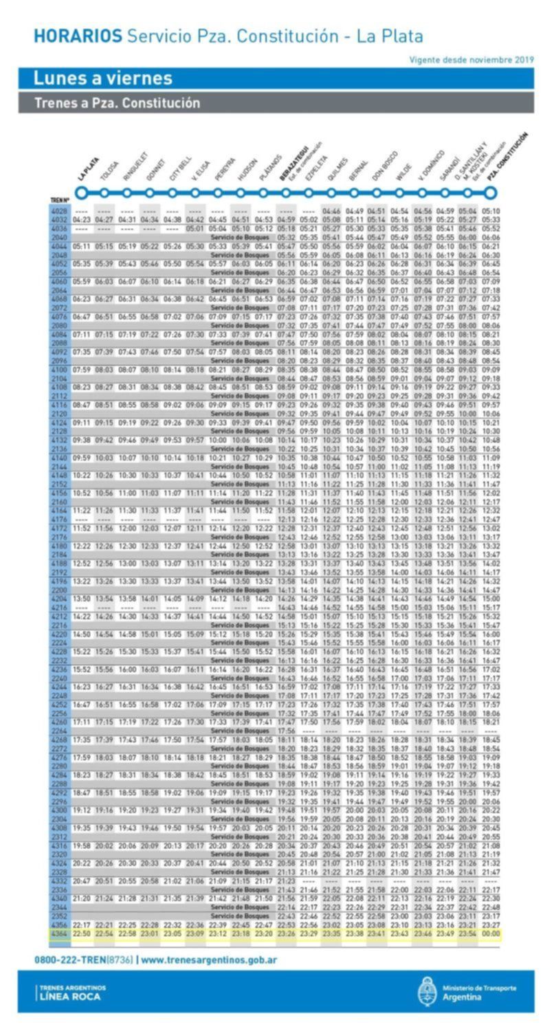A partir de este anuncio, los nuevos servicios partirán desde Constitución a La Plata a las 22.42 para llegar 23.52; mientras que desde La Plata a Constitución lo harán de 22.50 hasta la medianoche.