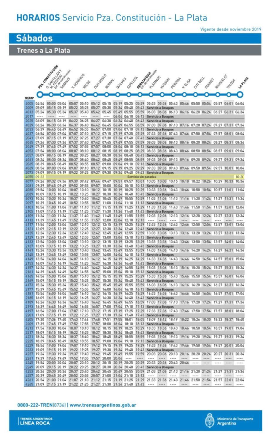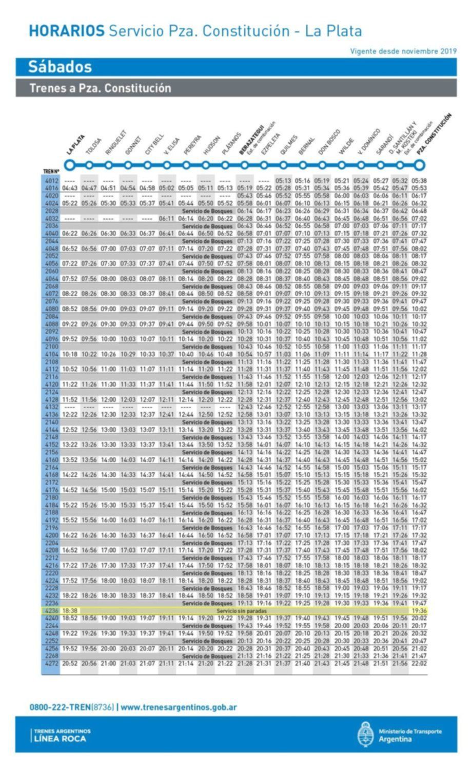 Los sábados, según se indicó, se trata de un servicio hasta La Plata que parte de Constitución a las 9.22 y llegará a la ciudad a las 10.20 y otro que hará el recorrido inverso desde las 18.38 hasta las 19.30.