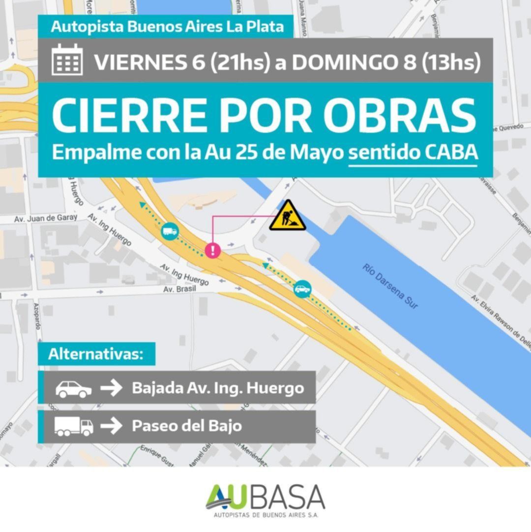 AUBASA informó que desde este viernes a las 21 y a lo largo del próximo fin de semana permanecerá cerrada la conexión entre las Autopistas que unen a La Plata con la Capital Federal y la 25 de Mayo, en dirección a la Ciudad de Buenos Aires.