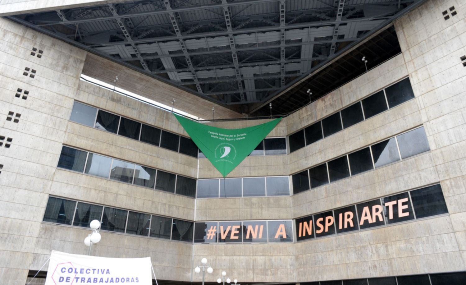 La convocatoria concluyó con el despliegue del enorme telón verde, el cual quedará colgado en la fachada del Teatro Argentino hasta el domingo 8 de marzo.