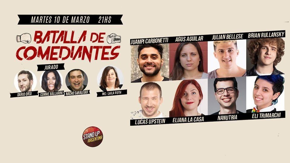 Stand Up Argentina organiza una batalla de comediantes feroz de 1 vs 1. Como una batalla de freestyle pero sin rimas ni flow ni nada que ver con el freestyle. Ocho comediantes combatirán con la comedia como única arma durante 2 minutos contra su oponente, que será sorteado en vivo. Cada ganador avanza en la llave pasando a la siguiente etapa hasta llegar a la final. El jurado decidirá con ayuda del publico y un Host nos llevara por toda esta competencia. Los comediantes participantes de la batalla de Marzo son: Juampi Carbonetti, Agustina Aguilar, Julian Bellese, Brian Rullansky, Lucas Upstein, Eliana La Casa, Nanutria y Eli Trimarchi. Y contamos con 3 jurados de lujo: Dario Orsi, Connie Ballarini y Nacho Saralegui.
