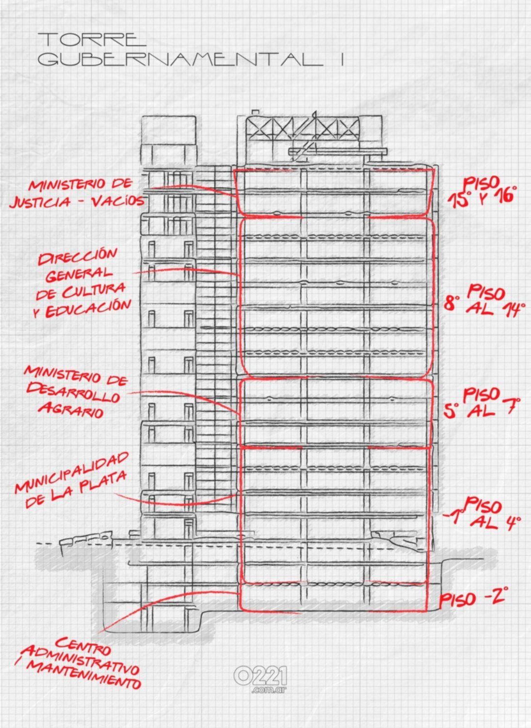 Las 37 plantas que suman las dos torres administrativas que flanquean a la Municipalidad de La Plata, frente a Plaza Moreno, concentran a buena parte de la administración pública provincial y algo de la municipal desde hace casi 33 años.
