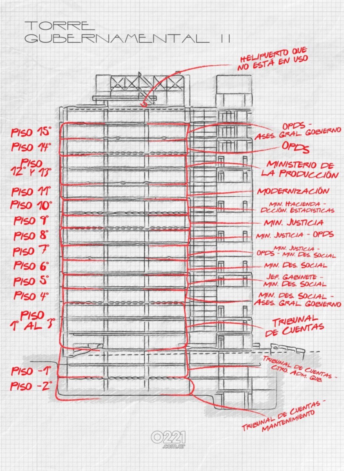 Sin embargo también comparte esos plantas con otra dependencias. En el séptimo está la Subsecretaría Legal y Técnica y oficinas de la Secretaría General, algunas áreas de Desarrollo Social y del OPDS (Organismo Provincial de Desarrollo Sustentable), así como la Delegación Fiscal, la Contaduría de la Provincia y la Dirección Provincial de estadísticas que depende del Ministerio de Hacienda y Finazas. El octavo lo comparte con el OPDS