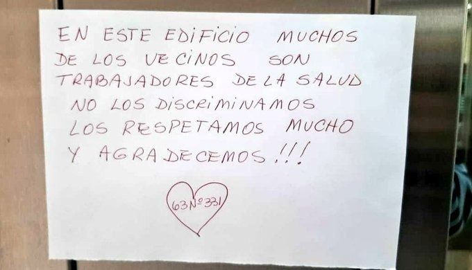 “En este edificio muchos de los vecinos son trabajadores de la salud. No los discriminamos, los respetamos mucho y agradecemos”, reza el mensaje en letras rojas que dejaron en el ingreso.