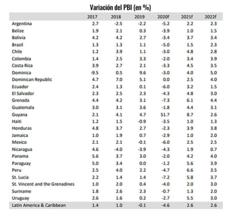 Según el informe, el Producto Bruto Interno de la Argentina caería un 5,2% en 2020, pero se espera una recuperación del 2,2% para 2021 y del 2,3% para 2022.