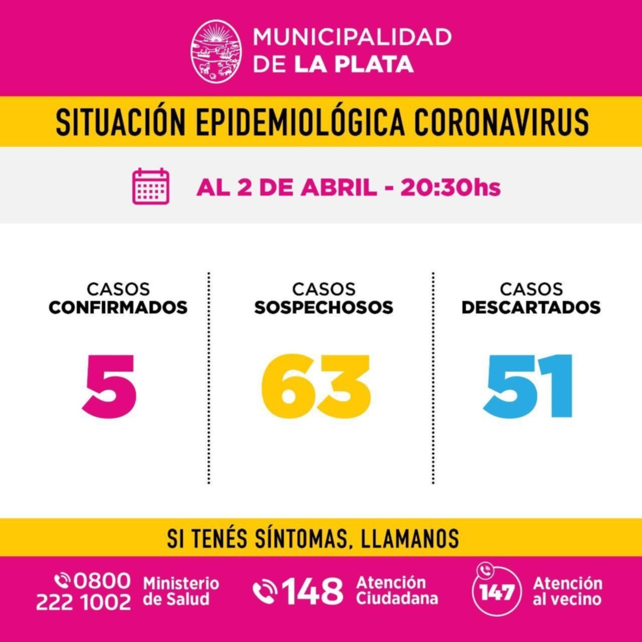 Este jueves, en tanto, los expertos del Instituto Malbrán informaron que las muestras tomadas dieron positivo para coronavirus y con ello se confirmó un nuevo caso en la ciudad. En esa línea, en la Comuna explicaron que hasta el momento hay 63 casos sospechosos en la ciudad y otros 51 ya fueron descartados por los especialistas.