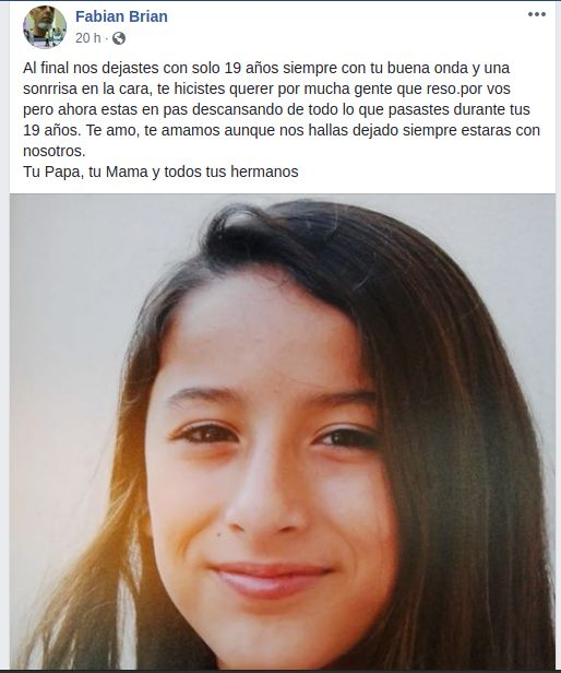 Fabián Brian, el papá de la arquera que entrenaba con la Primera y la Reserva de la Villa, también se expresó en la misma red social. “Al final nos dejaste con solo 19 años, siempre con tu buena onda y una sonrisa en la cara, te hiciste querer por mucha gente que rezó por vos, pero ahora estas en paz descansando de todo lo que pasaste durante tus 19 años. Te amo, te amamos, aunque nos hayas dejado siempre estarás con nosotros”, escribió.