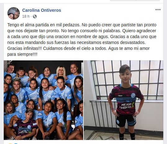 “Tengo el alma partida en mil pedazos. No puedo creer que partiste tan pronto que nos dejaste tan pronto. No tengo consuelo ni palabras”, escribió en Facebook Carolina Ontiveros, la mamá de la jugadora de 19 años que murió luego de estar varios días internada en el hospital Larraín por un problema renal.