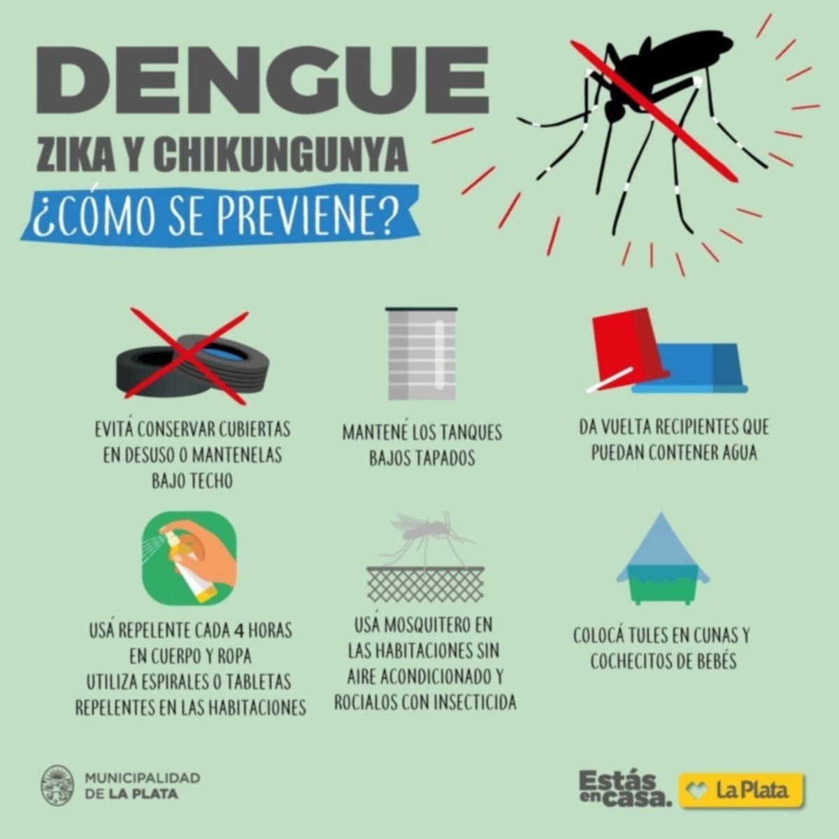 Cabe recordar que desde la Comuna, el Conicet y distintas universidades nacionales insistieron con una serie de consejos útiles para la limpieza de los espacios donde pueden formarse criaderos de mosquitos. Entre las recomendaciones figuran vaciar las regaderas luego de usarlas y guardarlas bajo techo para evitar que se llenen con agua de lluvia. Lo mismo indicaron para el caso de tener botellas en los patios: eliminar su contenido y almacenarlas boca abajo, o directamente destruirlas si no van a ser reutilizadas.